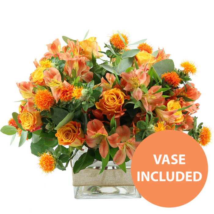 Discover the splendor of autumn with our Golden Horizon Bouquet. This stunning arrangement features a vibrant mix of orange roses and alstroemeria, beautifully complemented by Carthamus and Eucalyptus for a unique and elegant display.